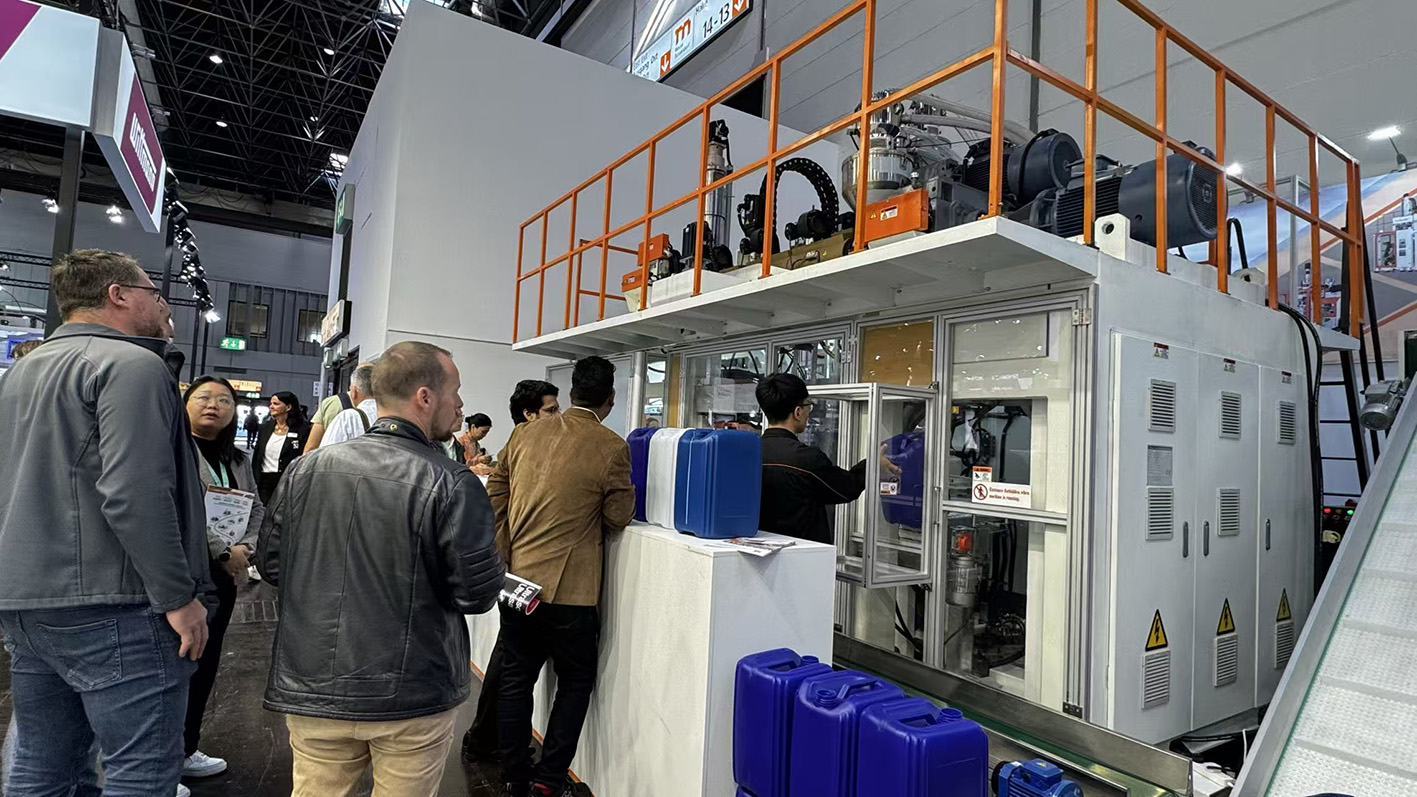 The star product brought by Leshan Intelligent – the all-new "South Pole Star" blow molding machine – was undoubtedly one of the brightest "stars" in the exhibition hall today. "South Pole Star" commenced its international debut with smooth and precise movements – live demonstration blow molding a 30L container! Its innovative mechanical structure, stable mold opening and closing, uniform blow molding process, and the final high-quality finished product captivated professional audiences, prompting them to stop, watch, take photos, and record videos.