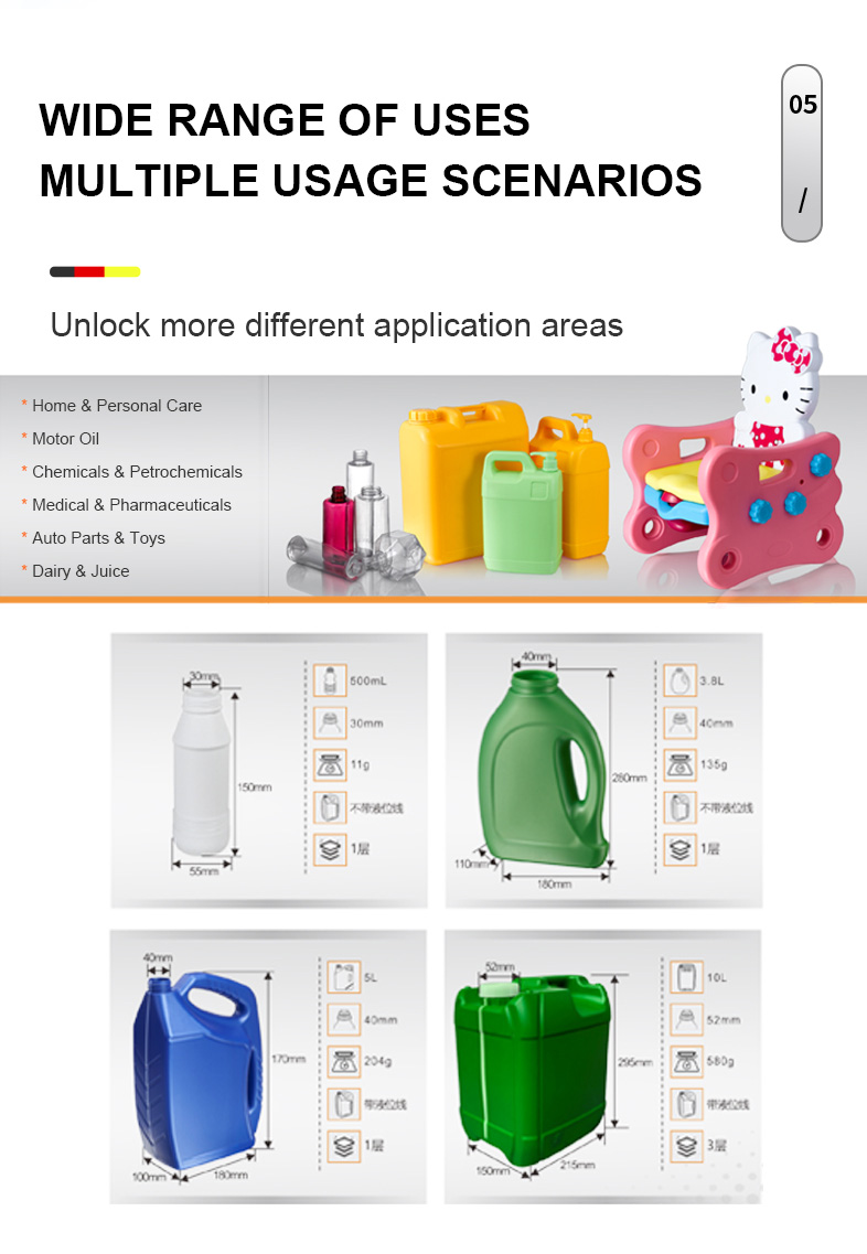 Designed in German, the brand new Athlon Series extrusion blow molding machine is exceeding even more. Equipped with the new designed clamping unit, the machines can run more smoothly and faster. More importantly, the RCI(Rapid Cooling Installation) ensures lower cycle time and higher production capacity. Besides, the machine is designed for the sake of workers. The quick mold change system and external machine adjustment not only increase the production efficiency but also protect the workers’ safety.